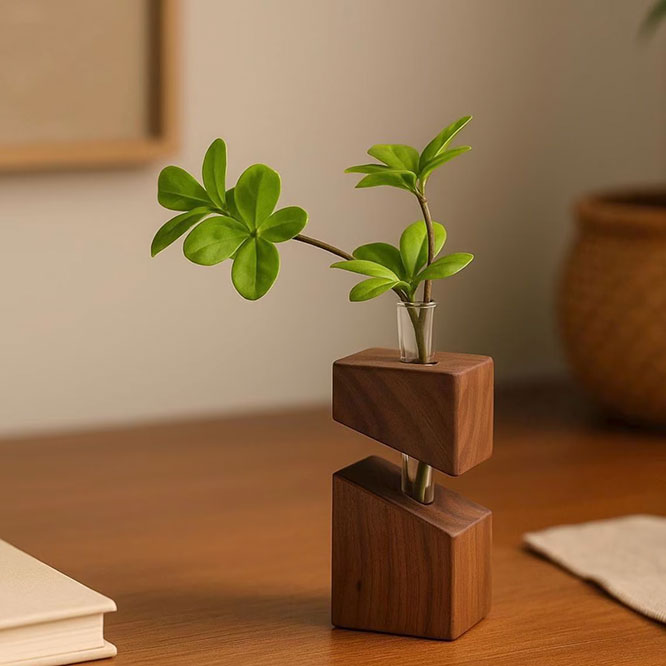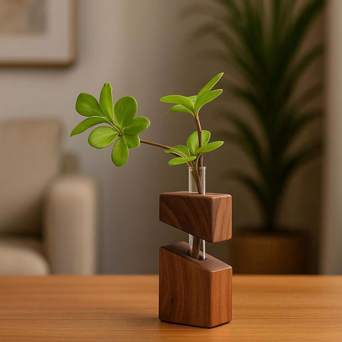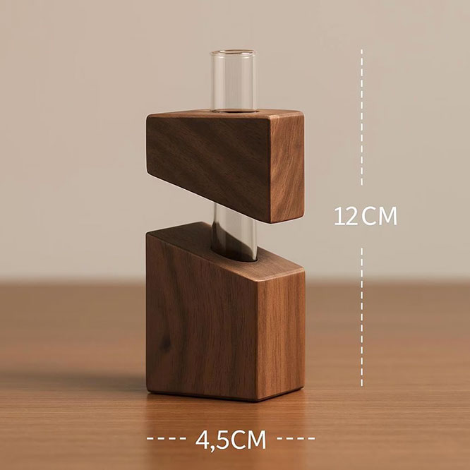 توضیحات: یک گلدان دکوری مینیمال و طبیعی که هر فضایی را دلنشین میکند. بدنه شفاف گلدان شیشه ای، شاخهها و گیاهان کوچک را بهخوبی به نمایش میگذارد و پایه چوبی با پرداخت صاف و تمیز، حس گرما و آرامش را به خانه میآورد. طراحی هندسی و ساده آن، جلوهای هنری و مدرن ایجاد میکند که با هر دکوراسیونی هماهنگ است. به دلیل استفاده از چوب طبیعی رنگ و موج چوب ممکن است کمی متفاوت باشد؛ این تفاوتها نشانه اصالت و منحصر به فرد بودن هر گلدان است. کوچک و جمعوجور، اما چشمگیر و مناسب برای شاخههای تازه گل، گلهای خشک و یا عود (به عنوان جاعودی) است. میتوان آن را روی میز کار، میز ناهارخوری یا طاقچه قرار داد و جلوهای دلنشین، طبیعی و هنری به خانه افزود. امکان حک جمله یا آرم و نشان شما روی این گلدان زیبا وجود دارد بنابراین میتوانید آن را به عنوان یک هدیه تبلیغاتی خاص به مخاطبان خود هدیه بدهید.